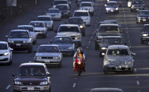 8 בבוקר. מנווט עם האופנוע בין המכוניות באיילון.